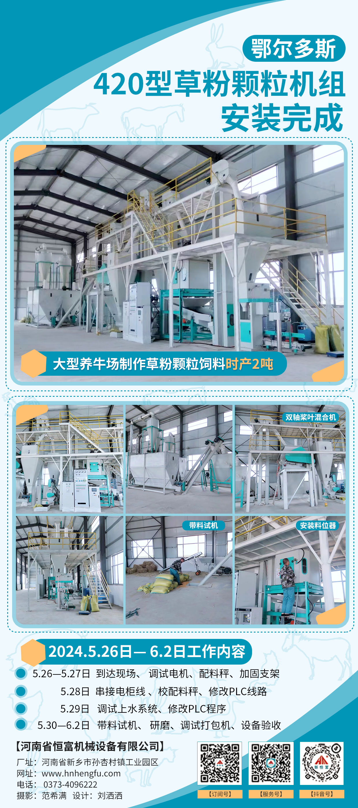 安裝完成的設備:非洲320型顆粒飼料機組、內蒙古鄂爾多斯(sī)420型草粉顆粒飼料機組。