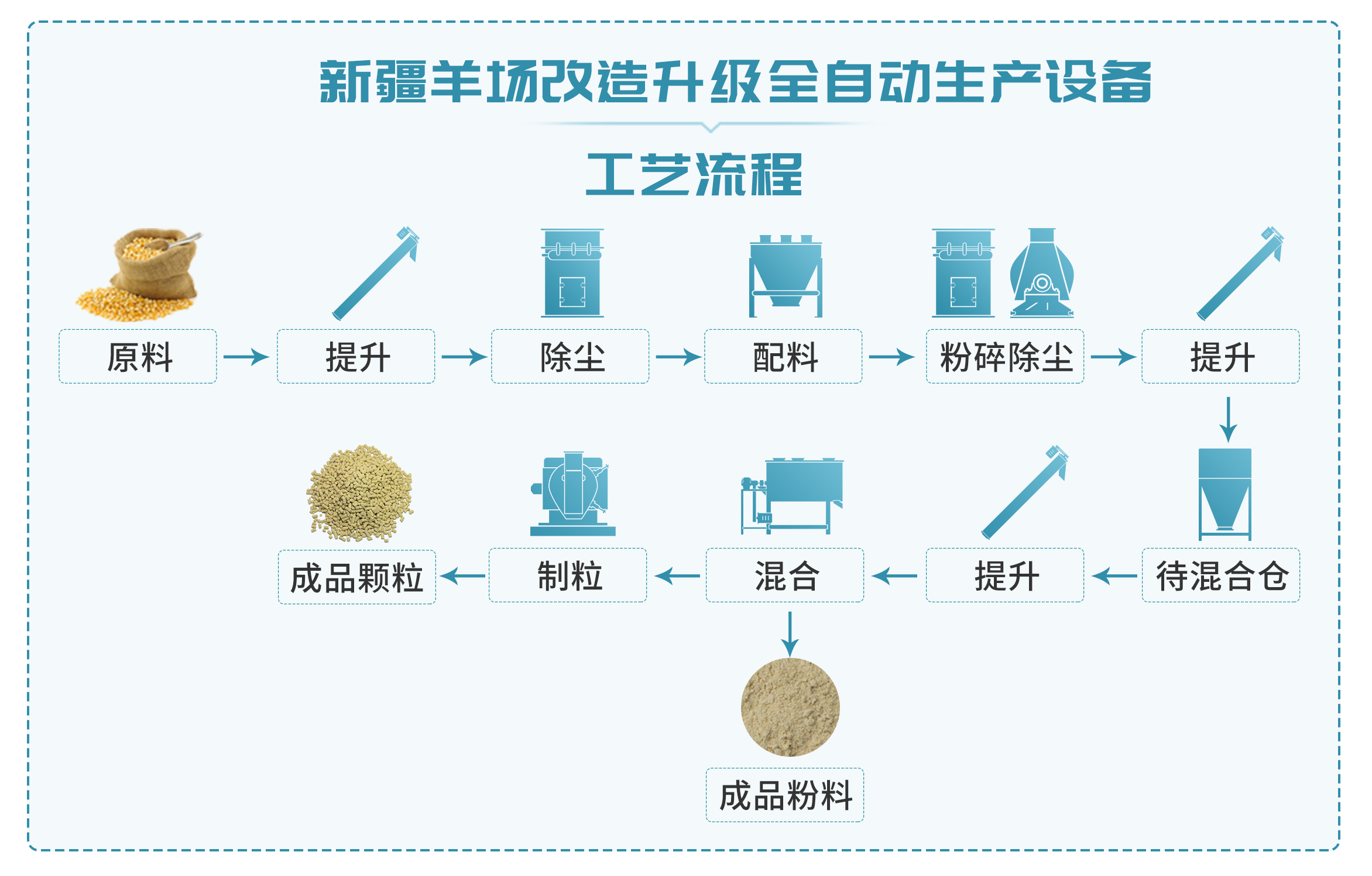 客戶是新疆當地的一家規模化種羊養殖有限公司,想在現(xiàn)有的草粉顆(kē)粒設備上(shàng)再增加一(yī)套精料顆粒(lì)設備,改(gǎi)造升級成全自動智能生產設備。
