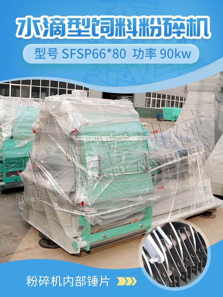 本條生產線是(shì)雙線粉狀飼料加工機組,采用了2台水滴型飼料粉碎機。