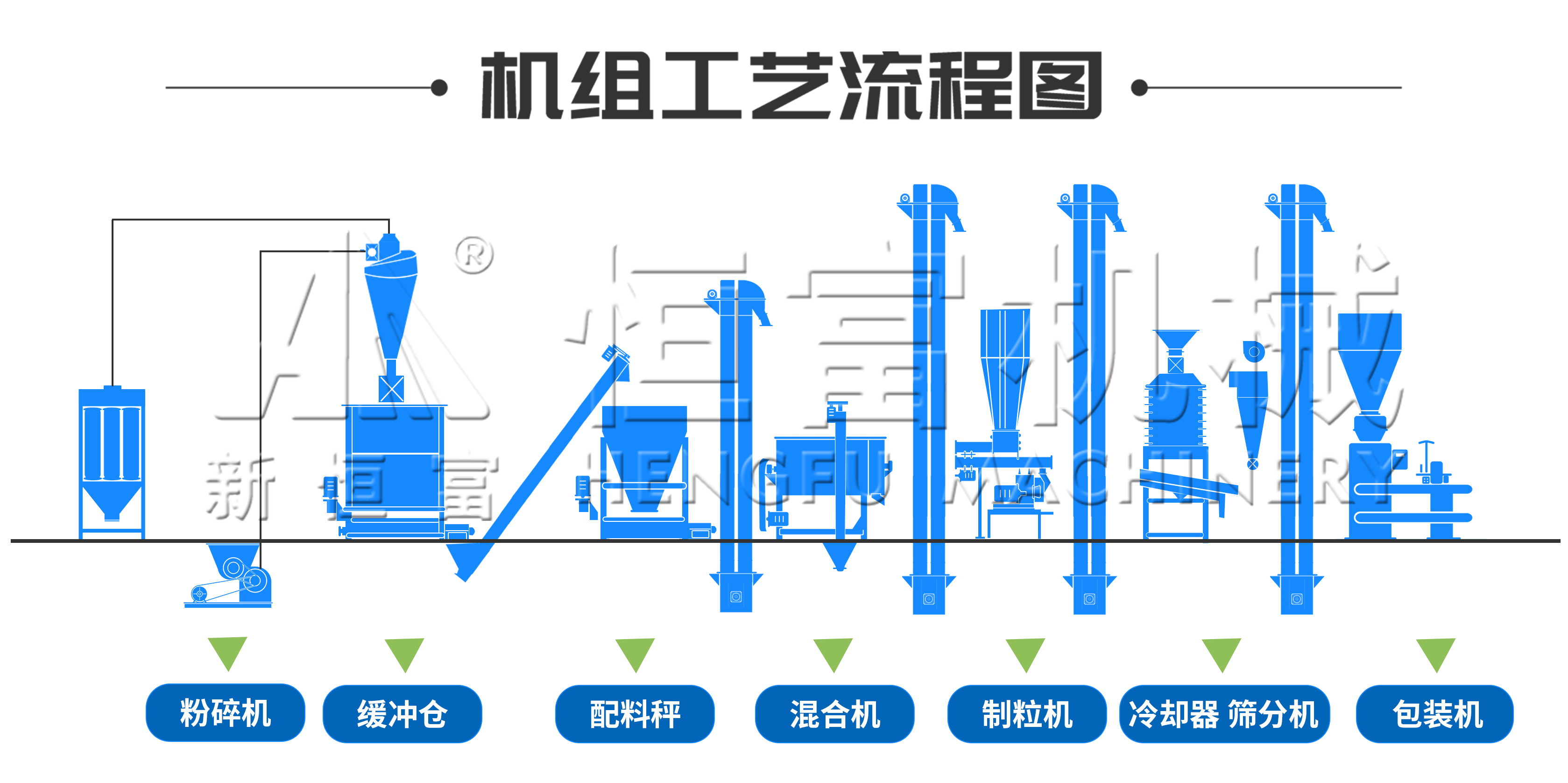 本套機組適合中小型養殖場(chǎng)、飼料加工廠使用,可做家(jiā)禽家畜的(de)精顆粒飼料以及草粉顆粒飼料(liào)。飼料顆粒機配備有喂(wèi)料器、調(diào)質(zhì)器以及強製(zhì)喂料器(qì),不僅可以(yǐ)勻速喂料(liào),還可以提高物料熟化程度,製作出來的顆粒飼料營養更(gèng)全麵(miàn),使動物更(gèng)容易吸收和消化。該機組主要設備有:多功能飼料粉碎機、臥式單軸雙螺帶飼料混(hún)合機、環模飼料顆粒機、逆(nì)流式(shì)飼料冷卻器、飼料振動篩、自動定量飼料包裝機等。