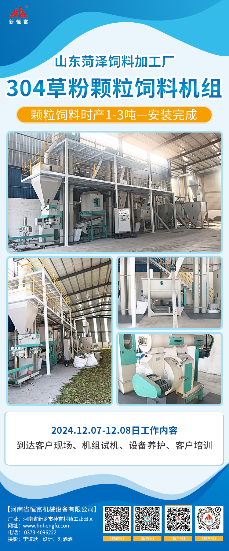 山東菏澤飼料加工(gōng)廠,時產1噸草粉顆粒飼料機組安裝完成。