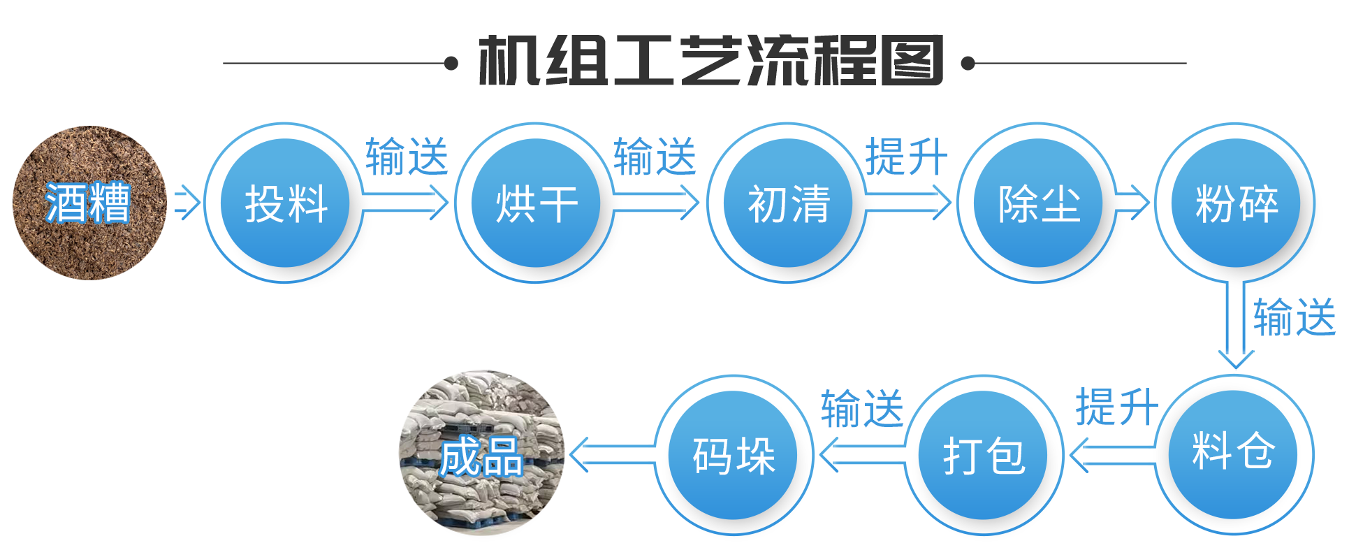 該生產(chǎn)線主要是以烘幹後的酒糟為原(yuán)料來製作牛的精補飼料。設備前端先對濕酒糟進行烘幹、初清處理,然後再進行粉碎、包裝、碼垛等。包含設(shè)備有:烘幹機(客戶自有)、圓筒原料初清篩、2台水滴型飼料(liào)粉碎機、2台脈(mò)衝(chōng)飼料(liào)除塵器、2個30m³鍍(dù)鋅料塔、4個2m³緩衝(chōng)倉、包裝碼垛設備、提升輸送設備以及控製係(xì)統(tǒng)等。