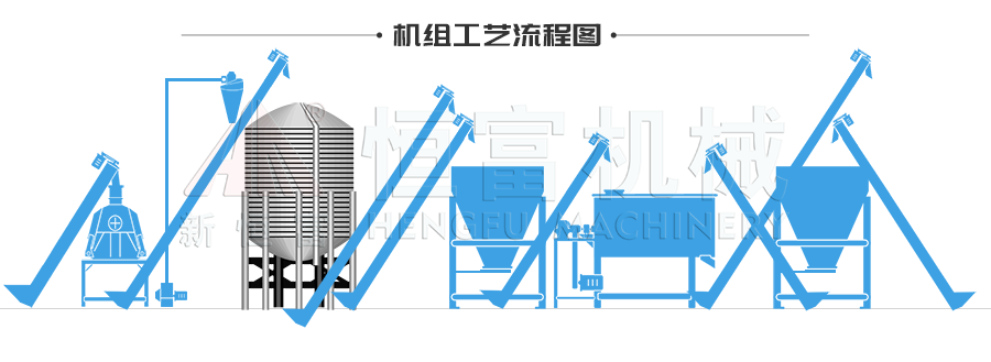 本(běn)套機(jī)組是一套製作粉狀飼料的設(shè)備,前端(duān)搭配水滴式飼料粉碎機(jī),中間配備一個8噸料塔以及(jí)兩個配料秤,後端(duān)搭配了臥式單軸雙螺帶飼料混合機。在原料粉碎的同時(shí),豆粕、麩皮、石粉能(néng)同步(bù)進行稱重(chóng)、配料,隨後所有物料一起進行混合。本條生產線不僅可以實現原料的精準配比,還能提高生產效(xiào)率,降低生產成本。