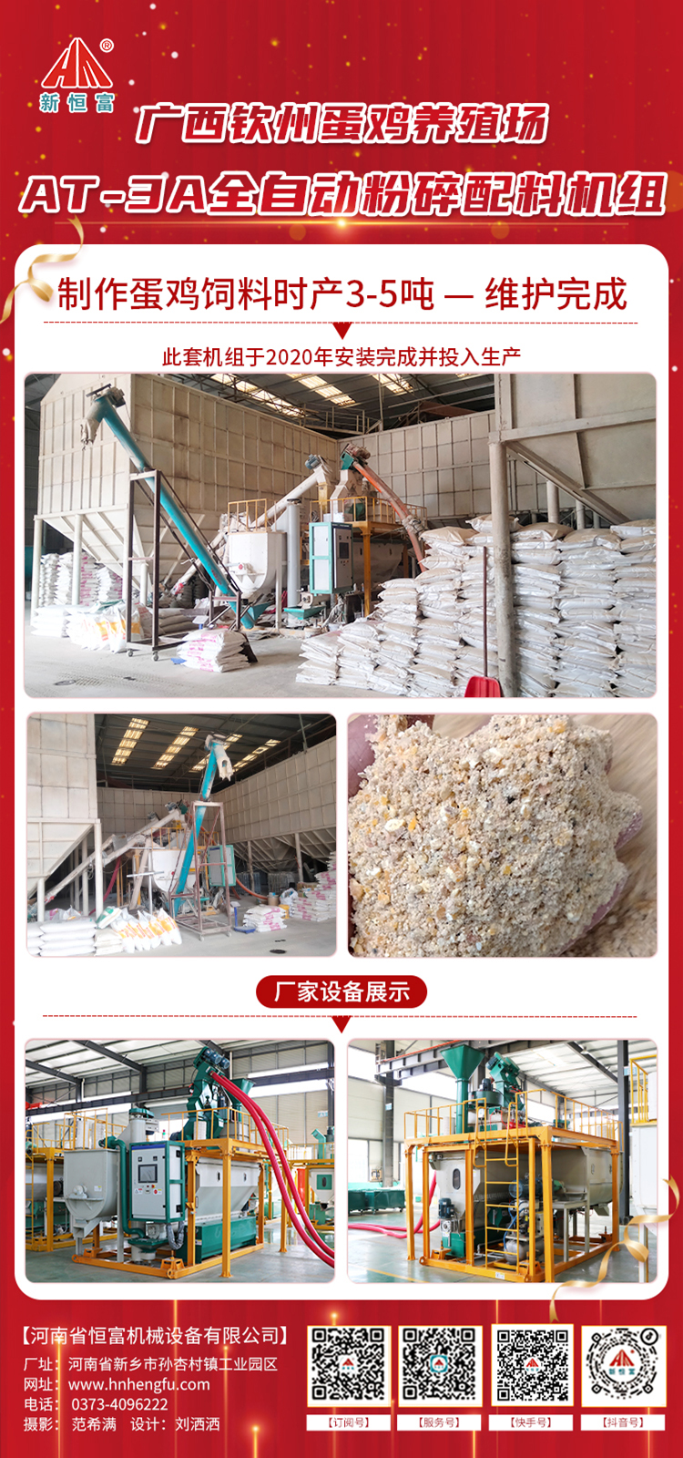 該生產線主要是做蛋雞粉狀飼料,前端配備(bèi)有高效飼料(liào)粉碎機用於粉碎玉米原料,中間搭配多個待混(hún)倉,用於(yú)儲存預混(hún)料、石粉、麩皮、豆粕,後端搭(dā)配一套AT-3A全自動粉碎配料機組,可對物(wù)料進行集中稱重、配料、注油、混合,混合後的飼料成品直接輸送至成品飼(sì)料(liào)倉進行存放。該設備適用(yòng)於各種飼料廠、養殖場使用(yòng),可加(jiā)工濃縮飼料、全價粉狀飼料等(děng)。