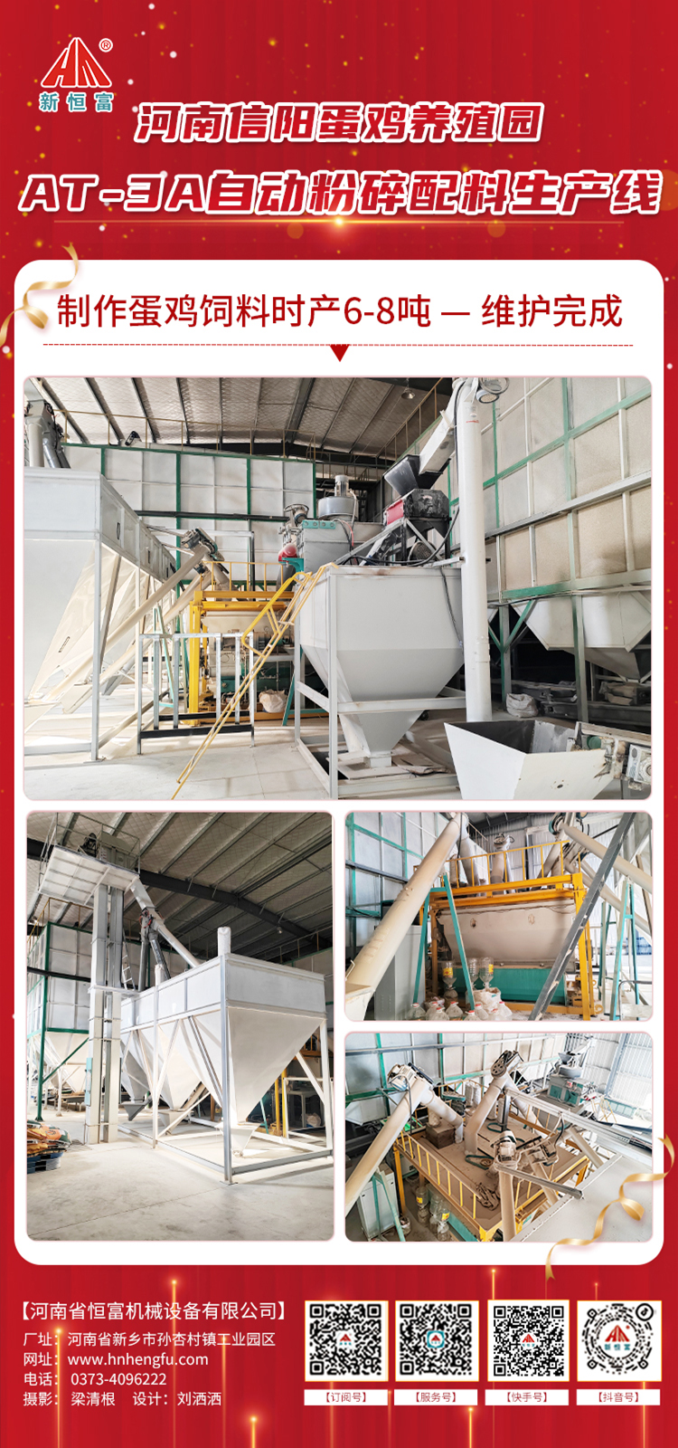 河南信陽蛋雞養殖園,時產(chǎn)6-8噸自(zì)動粉碎配料生產線維護完成(chéng)。