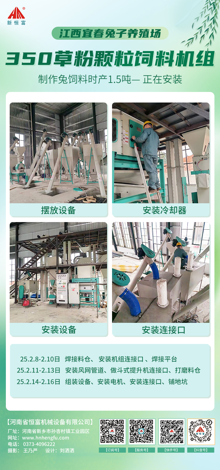 江西宜春兔子養殖場,時產1.5噸草粉(fěn)顆粒飼料加工機組正在(zài)安裝(zhuāng)。