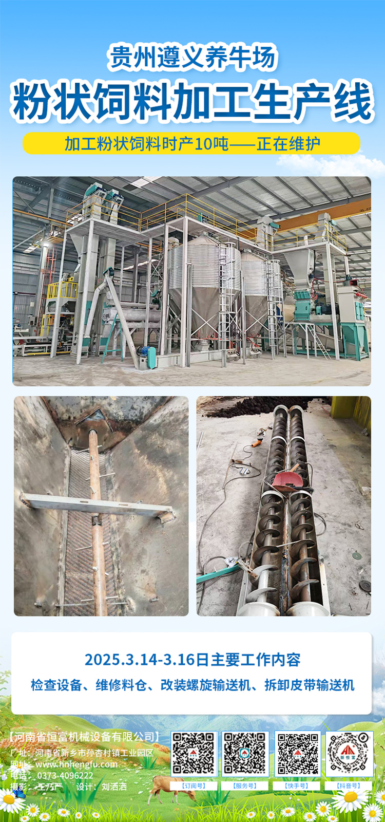 貴州遵義養牛場,時產(chǎn)10噸粉狀飼料加工生產線正(zhèng)在維護。