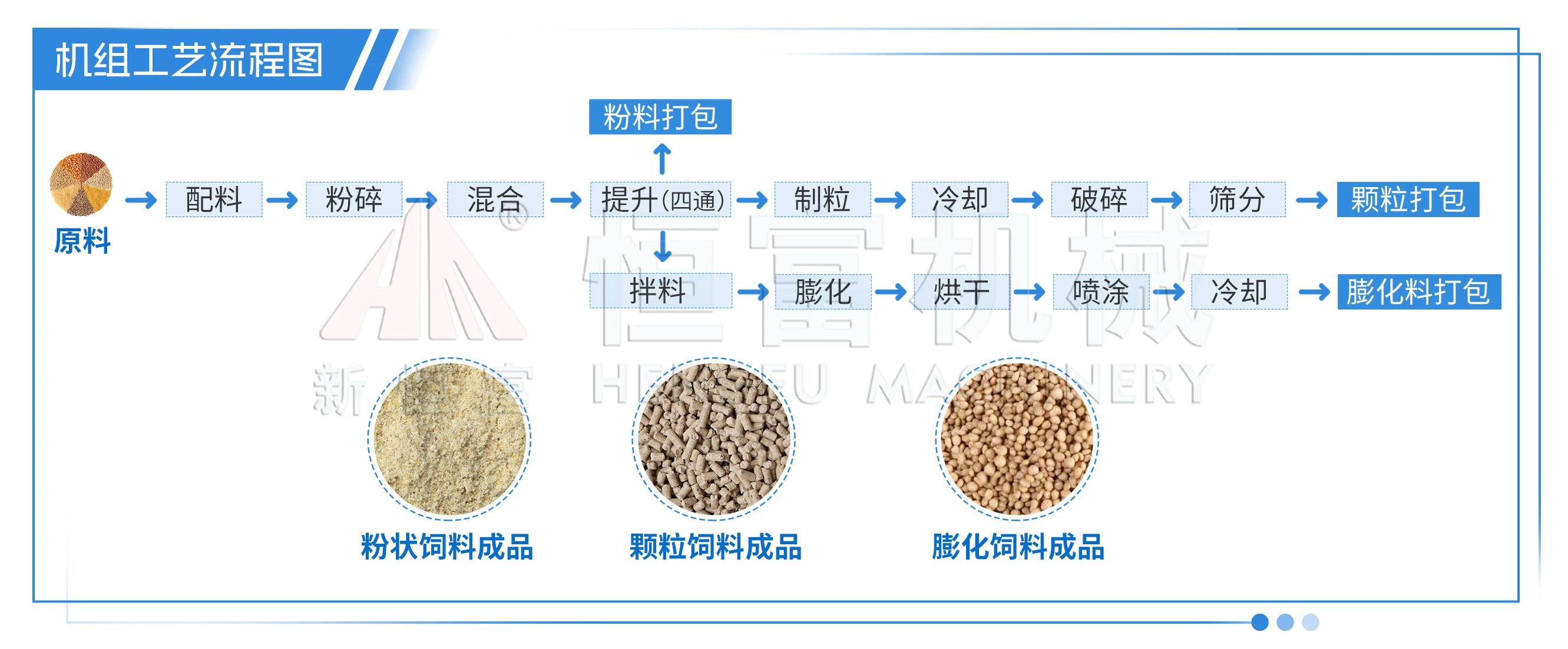 該設備前端是共用一套飼料配料秤、水滴型飼料粉碎機、飼(sì)料緩衝倉、臥式單軸雙螺帶飼料混(hún)合機,製作出來的成品粉狀(zhuàng)飼料直接進入自動定(dìng)量飼料包裝機進行打包;顆粒飼料生產線中(zhōng)間搭(dā)配有環模飼料顆粒機、逆流(liú)式飼料冷卻(què)器(qì)、對輥式飼料(liào)破碎機,後端搭(dā)配了飼料振動篩(shāi)以及自動定量飼料包裝(zhuāng)機;膨化飼料生產線中間(jiān)搭配有飼料膨化機、飼料烘幹機,後端搭配了飼料噴塗機、飼料冷卻器以及自動定量飼(sì)料包(bāo)裝機。