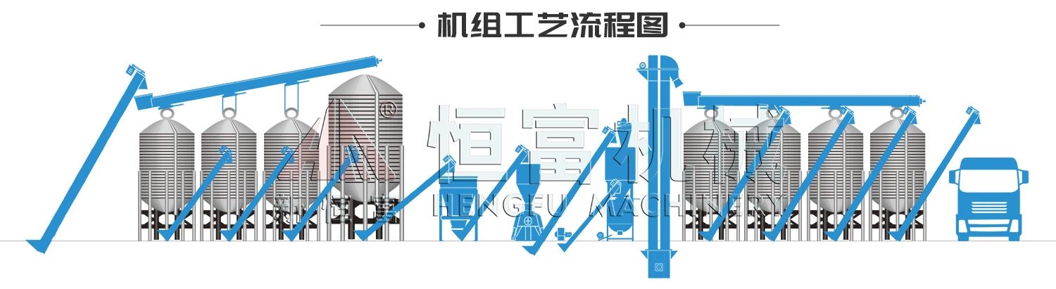 該條生產線包含設備有:烘幹機(客戶自有)、圓筒原料初清篩、2台水滴型飼(sì)料粉碎機、2台(tái)脈衝飼料除塵器、2個30m3鍍鋅料塔、2個2m3待粉碎倉、包裝碼垛設備、提升輸送設備以及(jí)控製係統等。