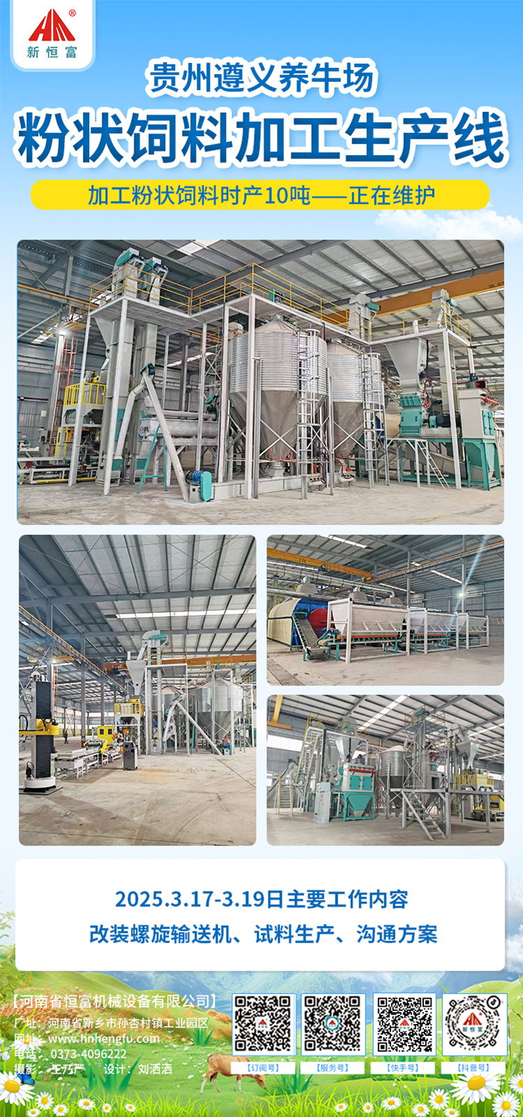 貴州(zhōu)遵義養牛(niú)場,時產10噸粉(fěn)狀飼料加工生產線設備改造正在(zài)維護。