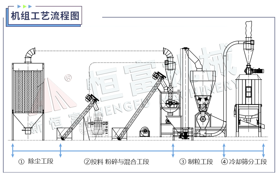 該機組搭配(pèi)的設備(bèi)有:布袋(dài)脈衝飼料除塵器、多功能飼(sì)料粉碎機、單軸雙螺旋飼料混合機、250型環模飼料顆粒機(jī)、逆流式飼料冷卻器以及飼料振動篩。