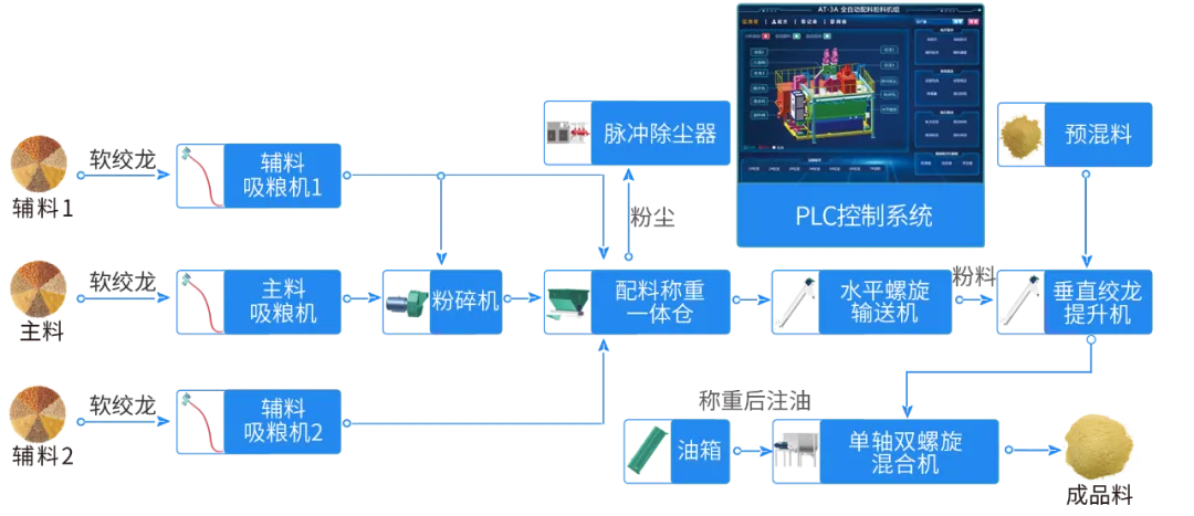 前(qián)端(duān)少量精料部分使用高效粉碎機;中間環節設有多個輔助料(liào)倉,用於存放預混料、石粉和麩皮;後(hòu)端(duān)則配備了(le)一套AT-3A型全自(zì)動粉(fěn)碎配料機組,同樣可與(yǔ)製粒機、打包機、儲存設施等組合使用,實(shí)現集中稱重(chóng)、配料(liào)、注油、混合和放料。經過改進,該機組的產量提升至每小時(shí)6-8噸(dūn)。