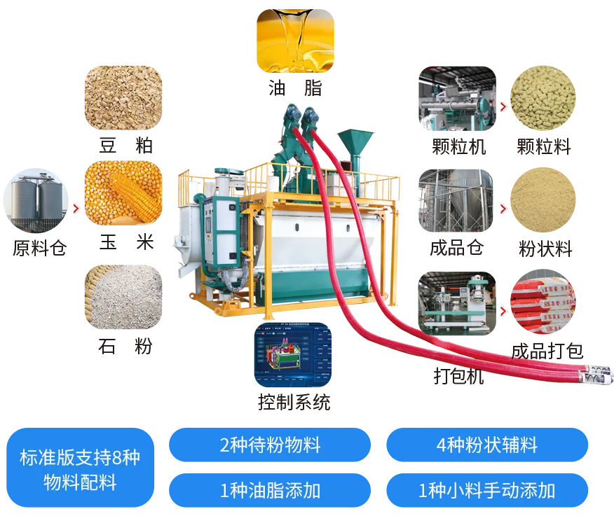 該搭配方式適用於各種(zhǒng)規格的大、中型飼料廠和養殖場使用(yòng)。配製(zhì)的(de)飼料成分均勻,無需特定場所即可實現連(lián)續生產,同時能夠生(shēng)產(chǎn)預混料、混合料、濃縮料和(hé)全粉(fěn)飼料(liào)等多種(zhǒng)產品。