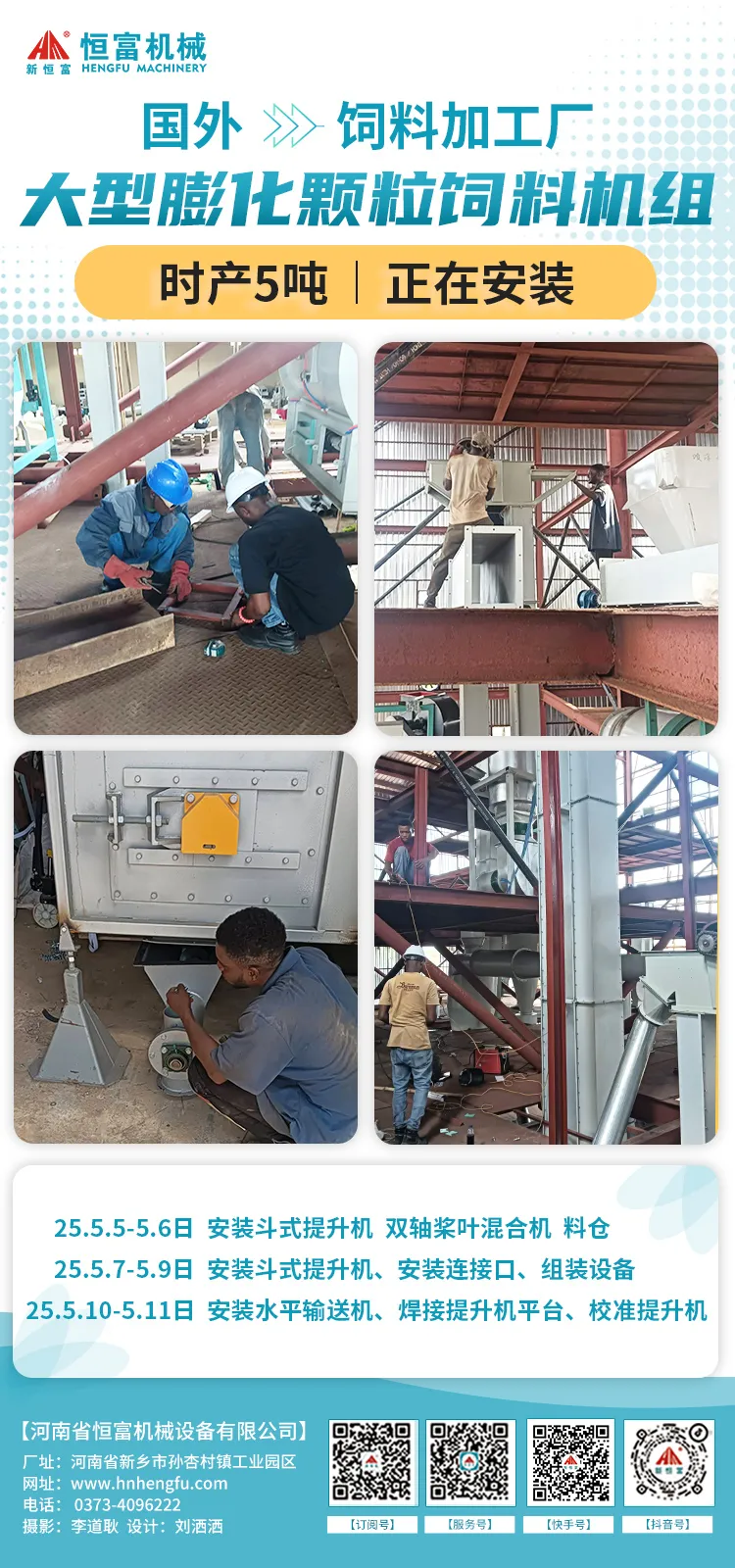 國外時產(chǎn)5噸膨化(huà)顆粒(lì)飼料生(shēng)產線正在安裝(zhuāng)。