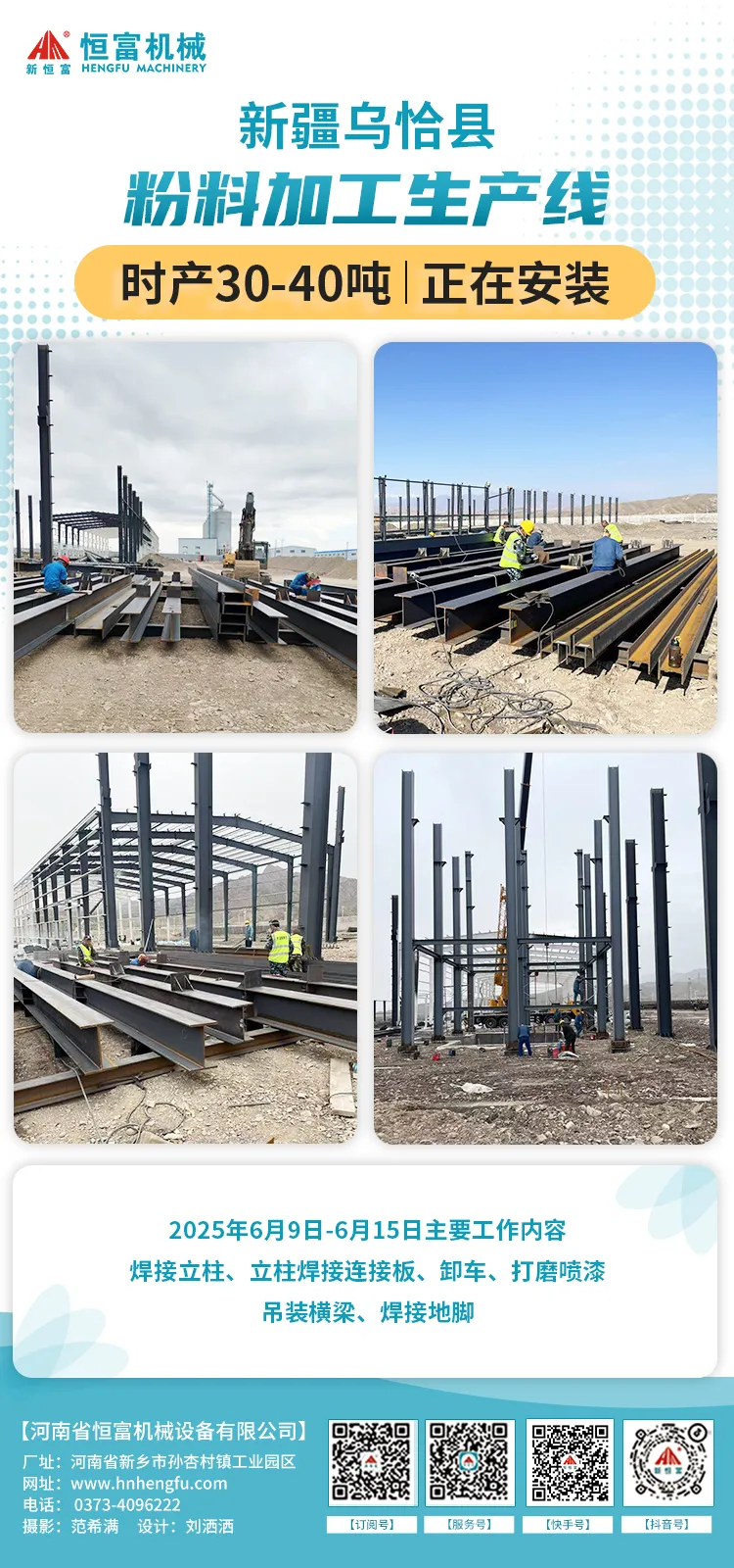 2025年6月9日至6月15日主要工(gōng)作內(nèi)容:地基(jī)水平校準,立柱(zhù)打梁,焊接立柱和(hé)連接板,打磨噴漆除鏽,吊裝橫(héng)梁,焊接地(dì)腳。