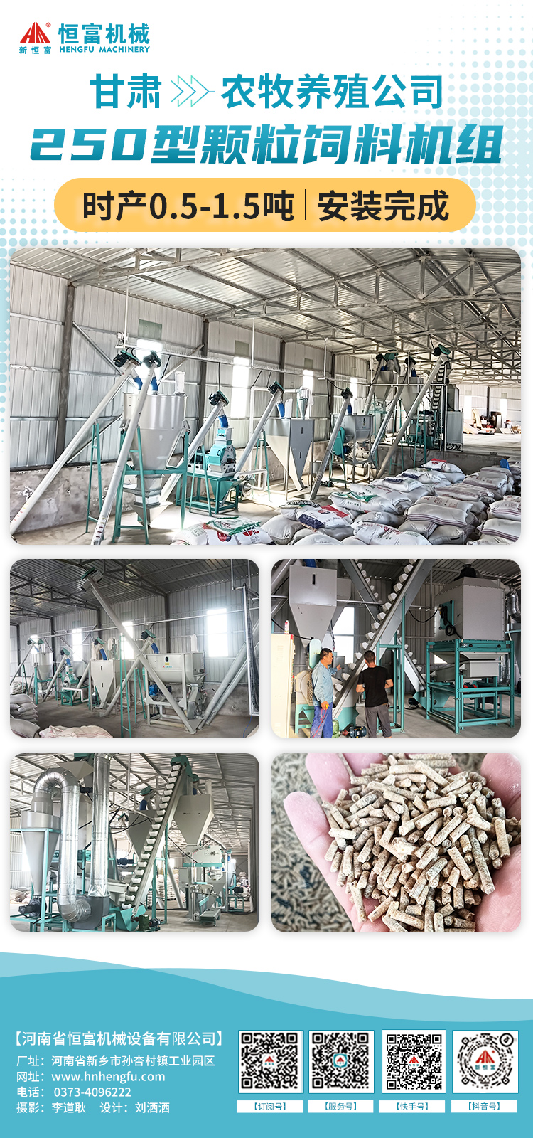 甘肅農牧養殖公司的 250 型環模顆粒飼料生產線安裝完成,可生產(chǎn)時產 0.5-1.5 噸的顆粒飼料和時產 3 噸的粉狀飼料,飼料除自用外主(zhǔ)要加工出售(shòu)。
