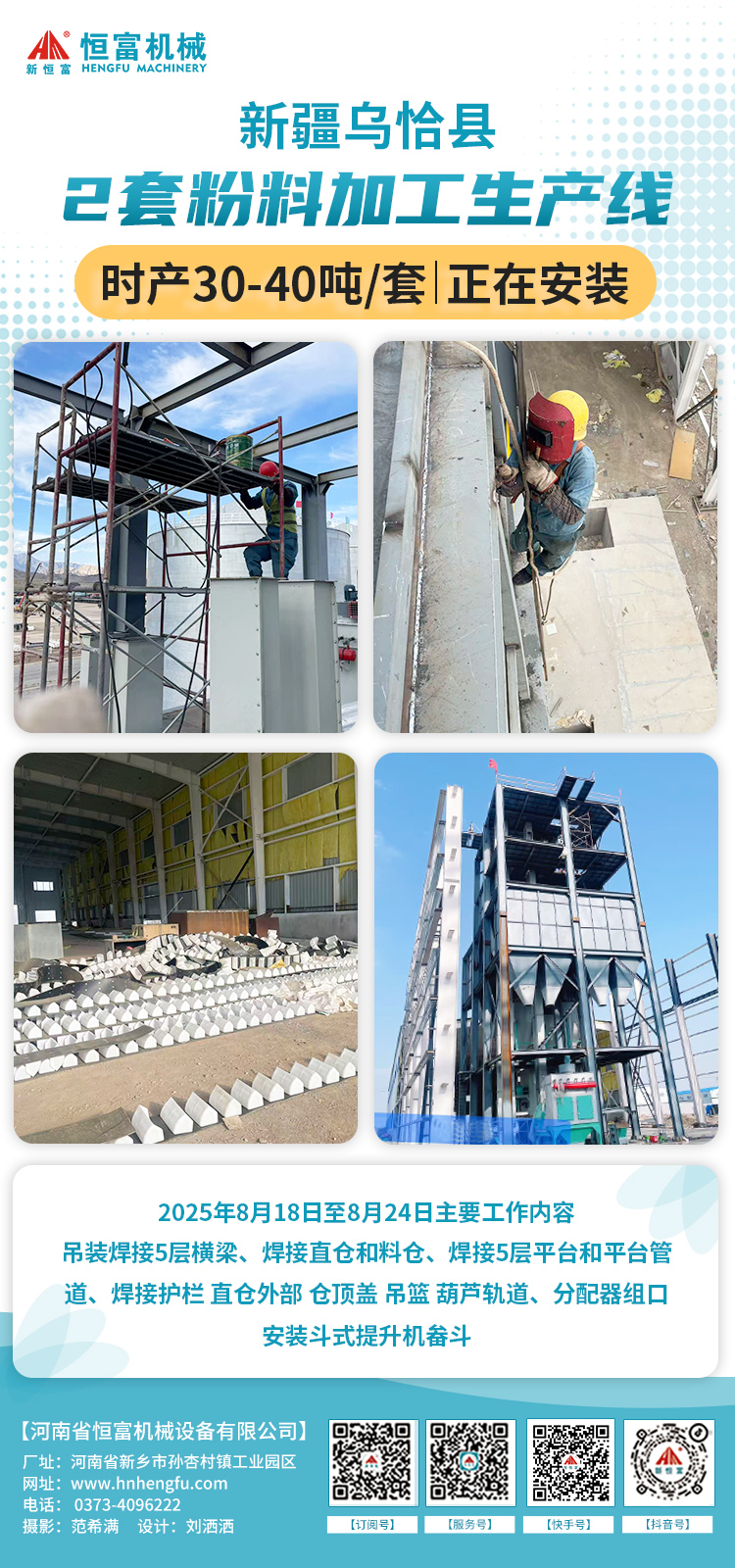 2025年8月18日-24日安裝師傅工(gōng)作內容:檢(jiǎn)查焊口(kǒu),裝空氣(qì)炮連接,做倉下氣道;拉(lā)主線、接小線;做吊裝準(zhǔn)備;拉線,按客戶(hù)要求與技術溝通增方案;做刮板、絞龍鏈接口;鋼板倉外焊口打膠防水,做上流管準備;吊裝 50T 倉、流管;刷漆,加固(gù)鋼板倉及鏈(liàn)接口,打(dǎ)膠;拉(lā)外部線並接線,加固鋼板倉,向學習人員講機器,刷補漆;與(yǔ)客戶(hù)溝通後,負責人安排油漆工到場。