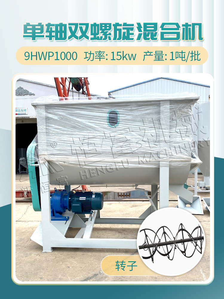 混合機的轉子是由兩個推動方向相反的帶式螺旋(xuán)組成,其攪拌能力強,攪拌(bàn)物料所需時間短,混合均勻性好。